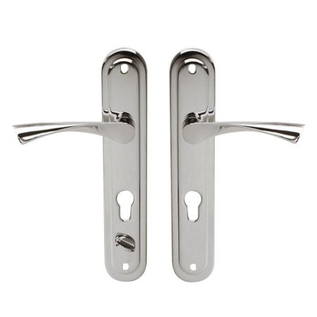 Ручки на планке под евроцилиндр с задвижкой (делятся на правые и левые комплекты) для замков Apecs T-0523-C-CR-L/R с межосевым расстоянием 80 мм.