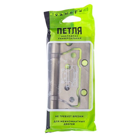Универсальные накладные петли Vanger из стали, не требующие врезки в дверное полотно, предназначены для деревянных межкомнатных дверей. Петли укомплектованы двумя проставочными кольцами, обеспечивающими плавность хода. Закаленные саморезы позволяют исполь