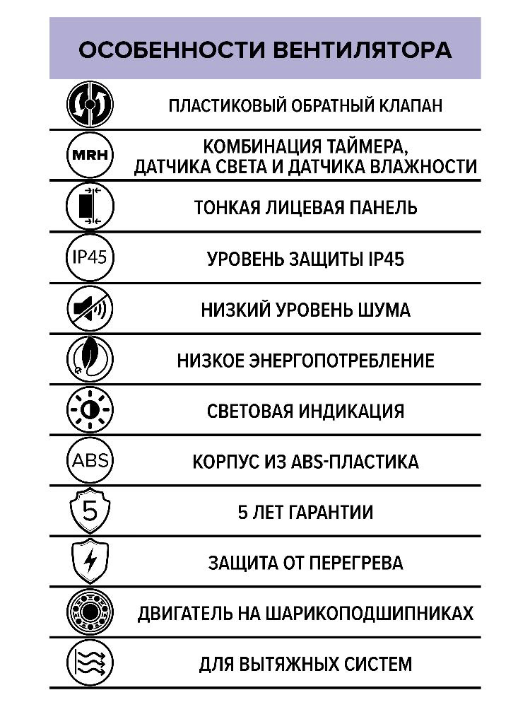 Вытяжные накладные вентиляторы. Для монтажа в вентиляционные шахты или соединения с воздуховодами. Тонкая лицевая панель. Двигатель на шарикоподшипниках с низким уровнем шума и увеличенным сроком службы (до 40 000 часов непрерывной работы). Сниженное энергопотребление. Подходит для монтажа в потолок (после снятия обратного клапана). Уровень защиты изделия – IP45.Опция MRH объединяет таймер и два датчика: света и влажности. Устройство включается и выключается в зависимости от уровня освещенности и влажности. По умолчанию уровень влажности, при котором вентилятор включается, установлена на уровне 70 %, а таймер задержки отключения — 15 мин. При желании уровень влажности можно изменить на 50 или 90 %, а таймер на 15 или 30 мин. Имеет режим проветривания: через каждые 12 часов вентилятор включается и работает в течение 30 мин. При необходимости можно установить интервалы проветривания (6, 12, 24 часа), либо отключить данный режим.
